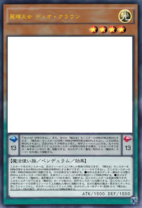| このカード名のモンスターは、自分フィールド上に1体しか表側で存在できず、「輝王女」モンスターを特殊召喚する為の素材以外の特殊召喚素材にする事ができず、リリースもできない。①このモンスターの召喚・特殊召喚成功時に発動できる。次の効果を全て適用する。●相手は自身のデッキ・墓地から攻撃力2000以上のモンスター1体を選び、自身のフィールド上に効果を無効にして特殊召喚する。●自分はデッキ・除外から「魔術玉」通常魔法カード2枚を選び、発動する。②このモンスターは直接攻撃できず、このモンスターの下にある「魔術玉」カードの数だけ、相手モンスターに攻撃できる。③このモンスターが相手のカードの効果でフィールド上を離れた場合に発動できる。自分の墓地の魔法・罠を全てデッキに戻してシャッフルし、そのターンのエンドフェイズ時、自分のデッキ・EXデッキ(表側)から「輝王女」モンスター1体を選び、自分フィールド上に特殊召喚する。 | |||