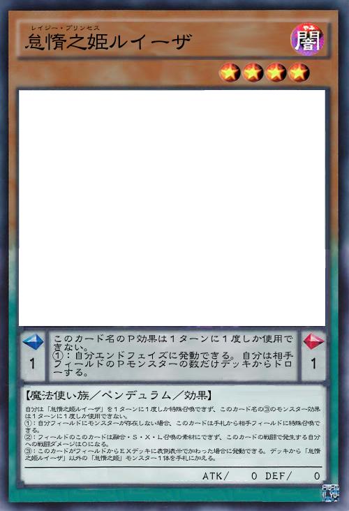 | 自分は「怠惰之姫ルイーザ」を1ターンに1度しか特殊召喚できず、このカード名の③のモンスター効果は1ターンに1度しか使用できない。 ①:自分フィールドにモンスターが存在しない場合、このカードは手札から相手フィールドに特殊召喚できる。 ②:フィールドのこのカードは融合・S・X・L召喚の素材にできず、このカードの戦闘で発生する自分への戦闘ダメージは0になる。 ③:このカードがフィールドからEXデッキに表側表示で加わった場合に発動できる。デッキから「怠惰之姫ルイーザ」以外の「怠惰之姫」モンスター1体を手札に加える。 | |||