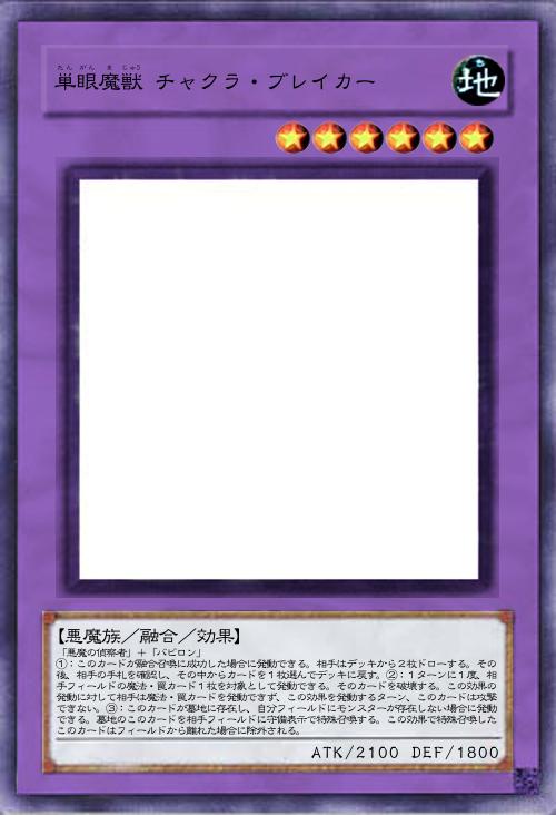 | 「悪魔の偵察者」+「バビロン」 ①:このカードが融合召喚に成功した場合に発動できる。相手はデッキから2枚ドローする。その後、相手の手札を確認し、その中からカードを1枚選んでデッキに戻す。②:1ターンに1度、相手フィールドの魔法・罠カード1枚を対象として発動できる。そのカードを破壊する。この効果の発動に対して相手は魔法・罠カードを発動できず、この効果を発動するターン、このカードは攻撃できない。③:このカードが墓地に存在し、自分フィールドにモンスターが存在しない場合に発動できる。墓地のこのカードを相手フィールドに守備表示で特殊召喚する。この効果で特殊召喚したこのカードはフィールドから離れた場合に除外される。 | |||