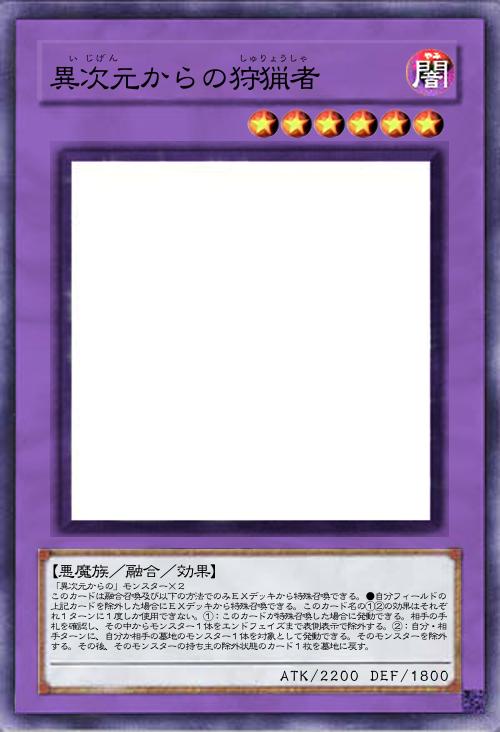 | 「異次元からの」モンスター×2 このカードは融合召喚及び以下の方法でのみEXデッキから特殊召喚できる。●自分フィールドの上記カードを除外した場合にEXデッキから特殊召喚できる。このカード名の①②の効果はそれぞれ1ターンに1度しか使用できない。①:このカードが特殊召喚した場合に発動できる。相手の手札を確認し、その中からモンスター1体をエンドフェイズまで表側表示で除外する。②:自分・相手ターンに、自分か相手の墓地のモンスター1体を対象として発動できる。そのモンスターを除外する。その後、そのモンスターの持ち主の除外状態のカード1枚を墓地に戻す。 | |||