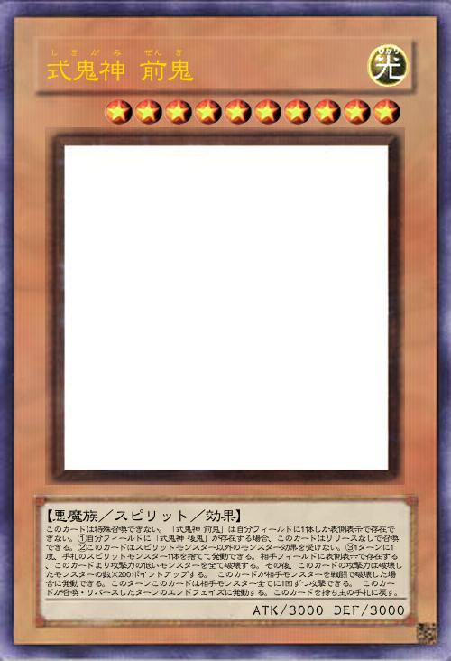 | このカードは特殊召喚できない。「式鬼神 前鬼」は自分フィールドに1体しか表側表示で存在できない。①自分フィールドに「式鬼神 後鬼」が存在する場合、このカードはリリースなしで召喚できる。②このカードはスピリットモンスター以外のモンスター効果を受けない。③1ターンに1度、手札のスピリットモンスター1体を捨てて発動できる。相手フィールドに表側表示で存在する、このカードより攻撃力の低いモンスターを全て破壊する。その後、このカードの攻撃力は破壊したモンスターの数×200ポイントアップする。➃このカードが相手モンスターを戦闘で破壊した場合に発動できる。このターンこのカードは相手モンスター全てに1回ずつ攻撃できる。➄このカードが召喚・リバースしたターンのエンドフェイズに発動する。このカードを持ち主の手札に戻す。 | |||