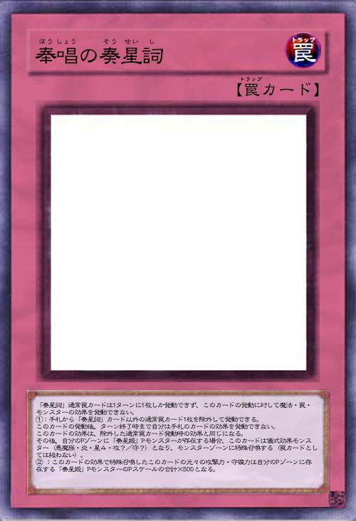| 「奏星詞」通常罠カードは1ターンに1枚しか発動できず、このカードの発動に対して魔法・罠・モンスターの効果を発動できない。 ①:手札から「奏星詞」カード以外の通常罠カード1枚を除外して発動できる。 このカードの発動後、ターン終了時まで自分は手札のカードの効果を発動できない。 このカードの効果は、除外した通常罠カード発動時の効果と同じになる。 その後、自分のPゾーンに「奏星姫」Pモンスターが存在する場合、このカードは儀式効果モンスター(悪魔族・炎・星4・攻?/守?)となり、モンスターゾーンに特殊召喚する(罠カードとしては扱わない)。 ② :このカードの効果で特殊召喚したこのカードの元々の攻撃力・守備力は自分のPゾーンに存在する「奏星姫」PモンスターのPスケールの合計×500となる。 | |||