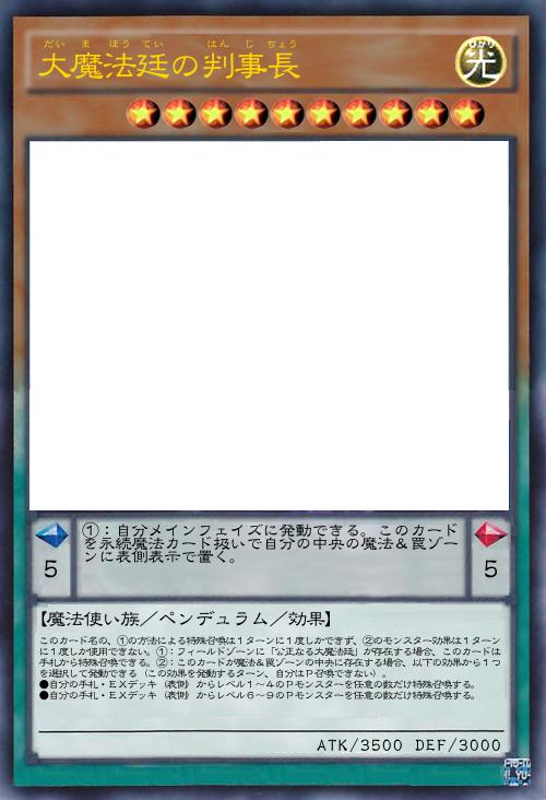 | このカード名の、①の方法による特殊召喚は1ターンに1度しかできず、②のモンスター効果は1ターンに1度しか使用できない。①:フィールドゾーンに「公正なる大魔法廷」が存在する場合、このカードは手札から特殊召喚できる。②:このカードが魔法&罠ゾーンの中央に存在する場合、以下の効果から1つを選択して発動できる(この効果を発動するターン、自分はP召喚できない)。 ●自分の手札・EXデッキ(表側)からレベル1~4のPモンスターを任意の数だけ特殊召喚する。 ●自分の手札・EXデッキ(表側)からレベル6~9のPモンスターを任意の数だけ特殊召喚する。 | |||