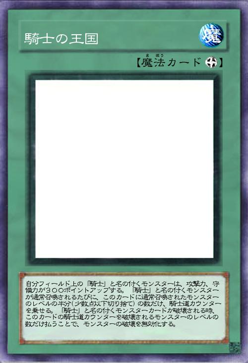 | 自分フィールド上の「騎士」と名の付くモンスターは、攻撃力、守備力が300ポイントアップする。「騎士」と名の付くモンスターが通常召喚されるたびに、このカードに通常召喚されたモンスターのレベルの半分(少数点以下切り捨て)の数だけ、騎士道カウンターを乗せる。「騎士」と名の付くモンスターカードが破壊される時、このカードの騎士道カウンターを破壊されるモンスターのレベルの数だけ払うことで、モンスターの破壊を無効化する。 | |||