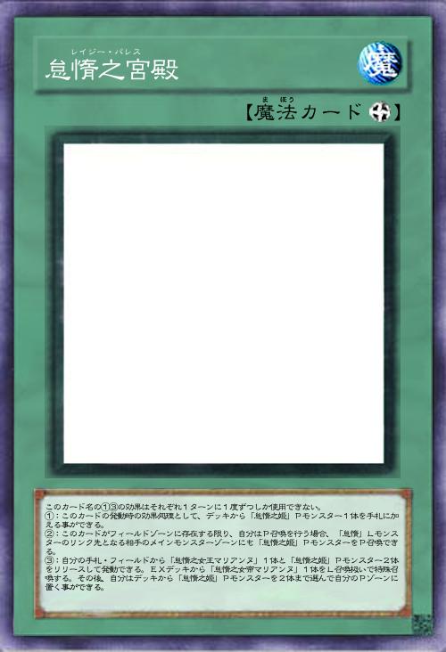 | このカード名の①③の効果はそれぞれ1ターンに1度ずつしか使用できない。 ①:このカードの発動時の効果処理として、デッキから「怠惰之姫」Pモンスター1体を手札に加える事ができる。 ②:このカードがフィールドゾーンに存在する限り、自分はP召喚を行う場合、「怠惰」Lモンスターのリンク先となる相手のメインモンスターゾーンにも「怠惰之姫」PモンスターをP召喚できる。 ③:自分の手札・フィールドから「怠惰之女王マリアンヌ」1体と「怠惰之姫」Pモンスター2体をリリースして発動できる。EXデッキから「怠惰之女帝マリアンヌ」1体をL召喚扱いで特殊召喚する。その後、自分はデッキから「怠惰之姫」Pモンスターを2体まで選んで自分のPゾーンに置く事ができる。 | |||