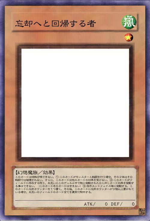 | このカードは特殊召喚できない。①:このカードがモンスターと戦闘を行う場合、その2体はその戦闘では破壊されない。さらに、このカードは他のカードの効果を受けない。②:このカードがフィールドに存在する限り、お互いにこのデュエル中で既に発動されたのと同じカード効果を発動する事はできない。(このカード名のカードは含まない)③:相手エンドフェイズ毎に発動する。このカードに忘却カウンターを1つ置く。その後、このカードに忘却カウンターが3個以上置かれている場合、お互いのフィールドのカード全てを裏側で除外する。 | |||