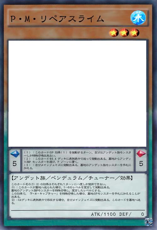 | このカード名の(1)(2)の効果はそれぞれ1ターンに一度しか使用できない。 (1):このカードが墓地へ送られた場合、1~6のレベルを宣言して発動出来る。 墓地のアンデット族Pモンスターを特殊召喚し、宣言したレベルにする。 この効果で、「P・M・キャプチャー」を特殊召喚した場合、墓地のPモンスターを手札に加えることが出来る。 (2):EXデッキに表側表示で存在する場合、自分メインフェイズに発動出来る。このカードを墓地へ送る。 | |||