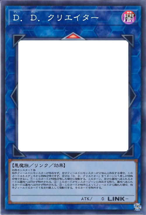 | 効果モンスター1体 相手フィールドにモンスターが存在せず、自分フィールドにモンスターが2体以上存在する場合、このカードはEXデッキから特殊召喚できず、自分は「D.D.クリエイター」を1ターンに1度しか特殊召喚できない。①:このカードが特殊召喚した場合に発動する。このターン、自分の墓地へ送られるカードは墓地へは行かず除外される。②:このカードがモンスターゾーンに存在する限り、墓地へ送られるカードは墓地へは行かず除外される。③:このカードが相手によってフィールドから離れた場合、相手フィールドのカード1枚を対象として発動できる。そのカードを除外する。 | |||