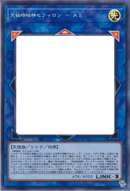 「技名や印象深いコンボを携えて新たにOCG化するシリーズのひとつとして、より原作再現度を優先した究極時械神セフィロンを作ってみました。文字数が足りないことに気づいて "AS" と省略形を取りましたが、これが "Accel Synchro" の頭文字とも一致しているのがすごく皮肉だなぁと思ったりします。