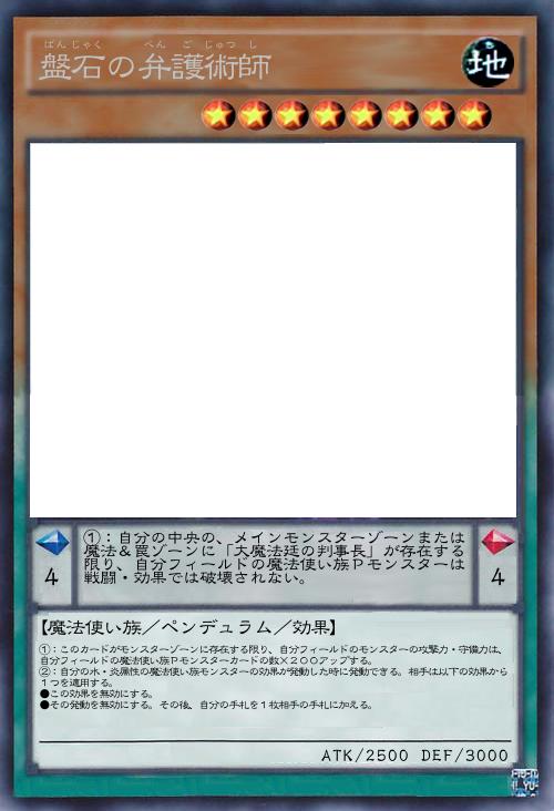| ①:自分の中央の、メインモンスターゾーンまたは魔法&罠ゾーンに「大魔法廷の判事長」が存在する限り、自分フィールドの魔法使い族Pモンスターは戦闘・効果では破壊されない。 | |||