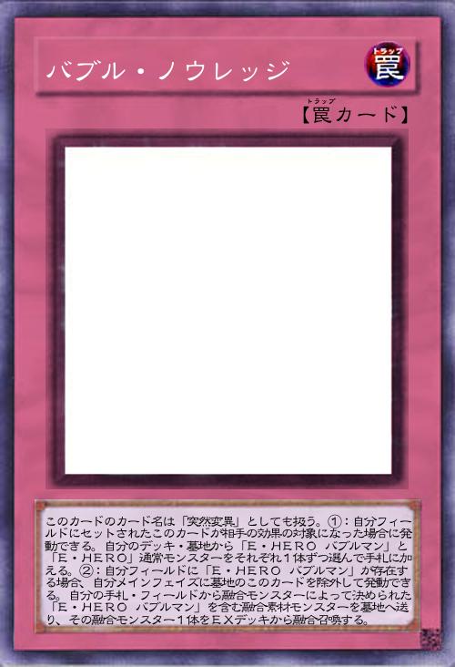| このカードのカード名は「突然変異」としても扱う。①:自分フィールドにセットされたこのカードが相手の効果の対象になった場合に発動できる。自分のデッキ・墓地から「E・HERO バブルマン」と「E・HERO」通常モンスターをそれぞれ1体ずつ選んで手札に加える。②:自分フィールドに「E・HERO バブルマン」が存在する場合、自分メインフェイズに墓地のこのカードを除外して発動できる。自分の手札・フィールドから融合モンスターによって決められた「E・HERO バブルマン」を含む融合素材モンスターを墓地へ送り、その融合モンスター1体をEXデッキから融合召喚する。 | |||