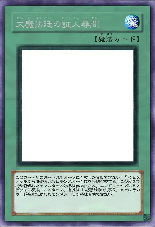 | このカード名のカードは1ターンに1枚しか発動できない。①:EXデッキから魔法使い族Lモンスター1体を特殊召喚する。この効果で特殊召喚したモンスターの効果は無効化され、エンドフェイズにEXデッキに戻る。このターン、自分は「大魔法廷の判事長」またはそのカード名が記されたモンスターしか特殊召喚できない。 | |||