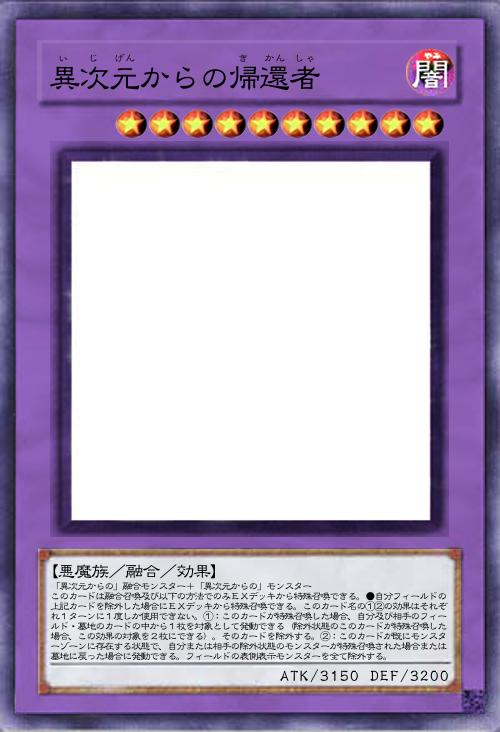 | 「異次元からの」融合モンスター+「異次元からの」モンスター このカードは融合召喚及び以下の方法でのみEXデッキから特殊召喚できる。●自分フィールドの上記カードを除外した場合にEXデッキから特殊召喚できる。このカード名の①②の効果はそれぞれ1ターンに1度しか使用できない。①:このカードが特殊召喚した場合、自分及び相手のフィールド・墓地のカードの中から1枚を対象として発動できる(除外状態のこのカードが特殊召喚した場合、この効果の対象を2枚にできる)。そのカードを除外する。②:このカードが既にモンスターゾーンに存在する状態で、自分または相手の除外状態のモンスターが特殊召喚された場合または墓地に戻った場合に発動できる。フィールドの表側表示モンスターを全て除外する。 | |||