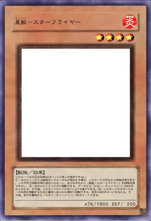 | このカード名の②の効果は1ターンに1度しか使用できない。 ①:自分フィールドに獣族モンスターのみが存在する場合、このカードは手札から特殊召喚できる。この方法で特殊召喚に成功したターン、自分は手札から「星獣-スターフライヤー」を特殊召喚できない。②:自分メインフェイズに発動できる。デッキから「スター・チェンジャー」1枚を手札に加える。その後、このカードのレベルを1つ上げる事ができる。③:このカードがXモンスターの効果を発動するために墓地へ送られた場合に発動できる。相手に400ダメージを与える。その後、自分の墓地から「スター・チェンジャー」1枚をセットできる。 | |||