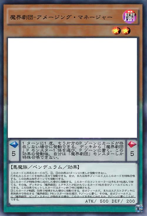 | 1ターンに1度、もう片方のPゾーンにカードが存在しない場合に発動できる。デッキから「魔界劇団」Pモンスター1体を選び、Pゾーンに置く。この効果の発動後、自分は「魔界劇団」モンスターしか特殊召喚できない。 | |||