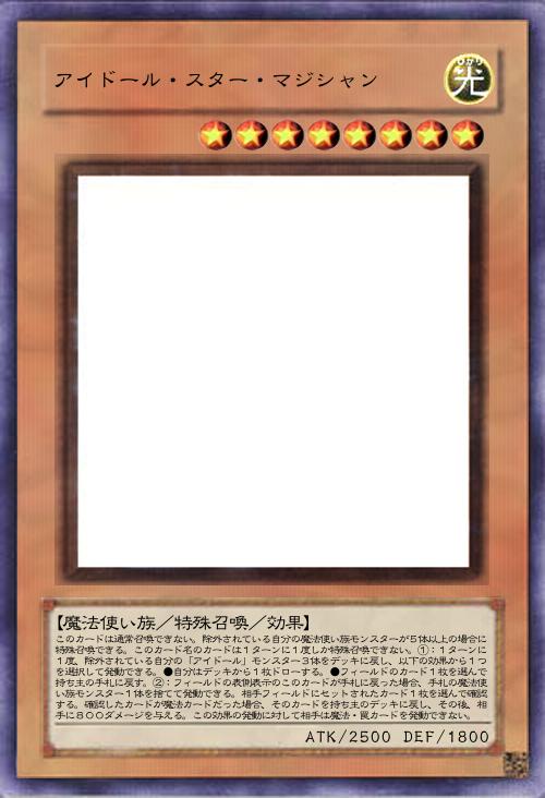 | このカードは通常召喚できない。除外されている自分の魔法使い族モンスターが5体以上の場合に特殊召喚できる。このカード名のカードは1ターンに1度しか特殊召喚できない。①:1ターンに1度、除外されている自分の「アイドール」モンスター3体をデッキに戻し、以下の効果から1つを選択して発動できる。●自分はデッキから1枚ドローする。●フィールドのカード1枚を選んで持ち主の手札に戻す。②:フィールドの表側表示のこのカードが手札に戻った場合、手札の魔法使い族モンスター1体を捨てて発動できる。相手フィールドにセットされたカード1枚を選んで確認する。確認したカードが魔法カードだった場合、そのカードを持ち主のデッキに戻し、その後、相手に800ダメージを与える。この効果の発動に対して相手は魔法・罠カードを発動できない。 | |||