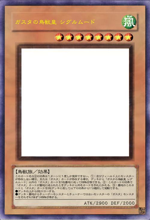 | このカード名の②の効果は1ターンに1度しか使用できない。①:自分フィールド上にモンスターが存在しない場合、または「ガスタ」カードが存在する場合、デッキから「ガスタの鳥獣皇 シグルムード」以外の「ガスタ」カードを1枚墓地に送って特殊召喚できる。②:このカードの効果で「ガスタ」カードが墓地に送られたときデッキから同名カードを手札に加える。③:墓地のこのカードと「ガスタ」カードを2枚デッキに戻して以下の効果から1つ選択して発動できる。 ●デッキの上から2枚ドローする。 ●デッキ・墓地からチューナーモンスターとチューナーではないモンスターの「ガスタ」モンスターをそれぞれ1体ずつ特殊召喚する。 | |||