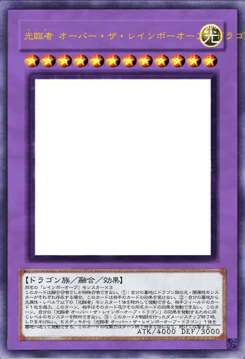 | 同名の「レインボーオーブ」モンスター×3 このカードは融合召喚でしか特殊召喚できない。①:自分の墓地にドラゴン族の光・闇属性モンスターがそれぞれ存在する場合、このカードは相手のカードの効果を受けない。②:自分の墓地から光属性・レベル7以下の「光臨者」モンスター1体を除外して発動できる。相手フィールドのカード1枚を選ぶ。このターン、相手はそのカード及びその同名カードの効果を発動できない。このターン、自分の「光臨者 オーバー・ザ・レインボーオーブ・ドラゴン」の効果を発動するために同じレベルのモンスターを除外できない。③:このカードが戦闘を行ったダメージステップ終了時、LPを半分払い、EXデッキから「光臨者 オーバー・ザ・レインボーオーブ・ドラゴン」1体を墓地へ送って発動できる。このカードの攻撃力はターン終了時まで倍になり、続けて攻撃する。 | |||