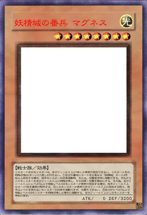 | このカード名のモンスターは、自分フィールド上に1体しか表側で存在できない。このカード名の特殊召喚は1ターンに1度しか行えない。①自分の墓地にカード名の異なる「妖精城」カードが5枚以上存在する場合、相手モンスターの効果発動時、または、攻撃宣言時に発動できる。手札からこのモンスターを自分フィールド上に特殊召喚し、その効果・攻撃を無効にする。その後、自分フィールド上にレベル7以上で奇数レベルのSモンスターが表側で存在する場合、相手フィールド上のカード1枚を裏側で除外する。②このモンスターが表側で自分フィールド上に存在する限り、相手はレベルを持たないモンスターの効果を発動できず、攻撃もできない。③自分がレベル7以上で奇数レベルのSモンスターを特殊召喚した場合に発動する。自分フィールド上のこのモンスターを手札に戻す。 | |||
