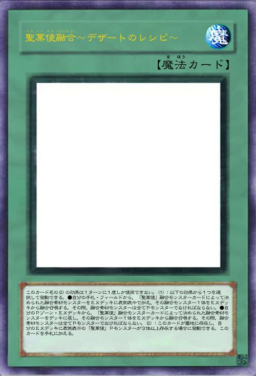 | このカード名の(2)の効果は1ターンに1度しか使用できない。(1):以下の効果から1つを選択して発動できる。●自分の手札・フィールドから、「聖菓使」融合モンスターカードによって決められた融合素材モンスターをEXデッキに表側表示で加え、その融合モンスター1体をEXデッキから融合召喚する。その際、融合素材モンスターは全てPモンスターでなければならない。●自分のPゾーン・EXデッキから、「聖菓使」融合モンスターカードによって決められた融合素材モンスターをデッキに戻し、その融合モンスター1体をEXデッキから融合召喚する。その際、融合素材モンスターは全てPモンスターでなければならない。(2):このカードが墓地に存在し、自分のEXデッキに表側表示の「聖菓使」Pモンスターが3体以上存在する場合に発動できる。このカードを手札に加える。 | |||
