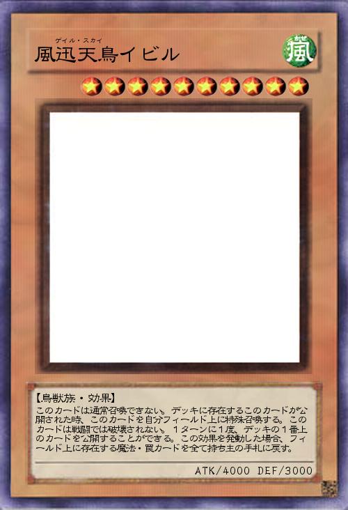 | このカードは通常召喚できない。デッキに存在するこのカードが公開された時、このカードを自分フィールド上に特殊召喚する。このカードは戦闘では破壊されない。1ターンに1度、デッキの1番上のカードを公開することができる。この効果を発動した場合、フィールド上に存在する魔法・罠カードを全て持ち主の手札に戻す。 | |||