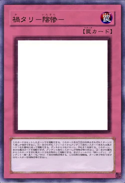 | このカードはセットしたターンでも発動できる。このカード名の①②の効果はそれぞれ1ターンに1度しか使用できない。①:自分の手札・フィールドからアンデット族モンスター1体または罠カード1枚を墓地に送って発動できる。デッキから2枚ドローし、手札を1枚捨てる。このターン、自分は魔法カードを発動できず、アンデット族モンスターしか特殊召喚できない。②:自分の墓地からこのカードを含む罠カード2枚を除外して発動できる。自分フィールドに「禍トークン」(アンデット・闇・星1・攻/守0)1体を特殊召喚する。この効果の発動後、ターン終了時まで自分はモンスターを特殊召喚できない。 | |||