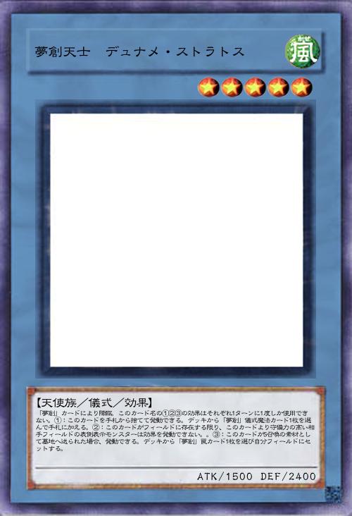 | 「夢創」カードにより降臨。このカード名の①②③の効果はそれぞれ1ターンに1度しか使用できない。①:このカードを手札から捨てて発動できる。デッキから「夢創」儀式魔法カード1枚を選んで手札に加える。②:このカードがフィールドに存在する限り、このカードより守備力の高い相手フィールドの表側表示モンスターは効果を発動できない。。③:このカードがS召喚の素材として墓地へ送られた場合、発動できる。デッキから「夢創」罠カード1枚を選び自分フィールドにセットする。 | |||