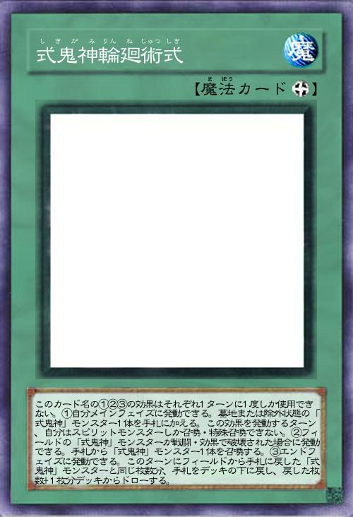 | このカード名の①②③の効果はそれぞれ1ターンに1度しか使用できない。①自分メインフェイズに発動できる。墓地または除外状態の「式鬼神」モンスター1体を手札に加える。この効果を発動するターン、自分はスピリットモンスターしか召喚・特殊召喚できない。②フィールドの「式鬼神」モンスターが戦闘・効果で破壊された場合に発動できる。手札から「式鬼神」モンスター1体を召喚する。③エンドフェイズに発動できる。このターンにフィールドから手札に戻した「式鬼神」モンスターと同じ枚数分、手札をデッキの下に戻し、戻した枚数+1枚分デッキからドローする。 | |||