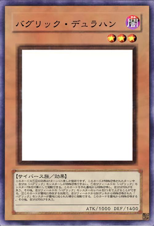 | このカードの①②の効果は1ターンに1度しか使用できず、このカードが特殊召喚されたターン中、自分は「バグリック」モンスターしか特殊召喚できない。①自分フィールドの「バグリック」モンスター1体を対象にして発動できる。このカードを手札墓地から特殊召喚し、自分は700LPを失う。その後、自分フィールドの「バグリック」モンスターのレベルを2つまで上げることができる。②このカードが墓地に存在する状態で、自分フィールドからEXデッキから特殊召喚された「バグリック」モンスターが墓地に送られた場合に発動できる。このカードを墓地から特殊召喚する。その後、自分は700LPを失う。 | |||