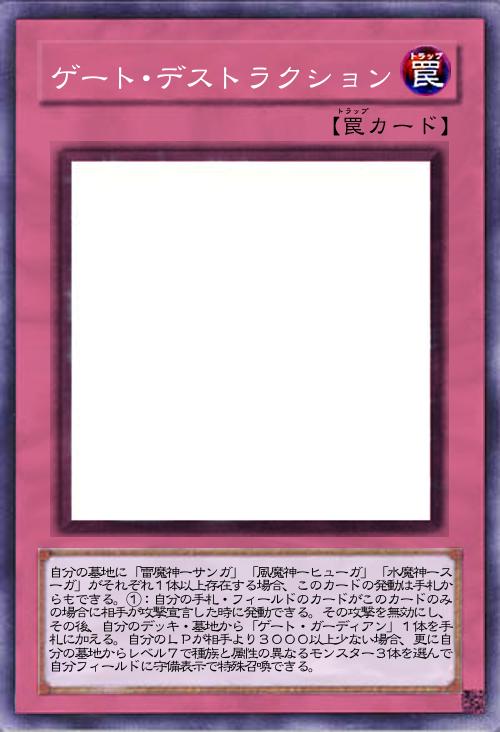 | 自分の墓地に「雷魔神ーサンガ」「風魔神ーヒューガ」「水魔神ースーガ」がそれぞれ1体以上存在する場合、このカードの発動は手札からもできる。①:自分の手札・フィールドのカードがこのカードのみの場合に相手が攻撃宣言した時に発動できる。その攻撃を無効にし、その後、自分のデッキ・墓地から「ゲート・ガーディアン」1体を手札に加える。自分のLPが相手より3000以上少ない場合、更に自分の墓地からレベル7で種族と属性の異なるモンスター3体を選んで自分フィールドに守備表示で特殊召喚できる。 | |||
