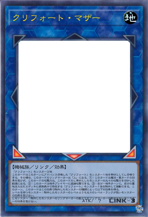 | 「クリフォート」モンスター2体 このカードはこのターンにアドバンス召喚した「クリフォート」モンスター1体を素材としてL召喚できる。その場合、このカードのリンクマーカーは「上」になる。①:このカードは魔法・罠カードの効果を受けず、このカードの攻撃力は、このカードのL素材としたモンスターの元々の攻撃力を合計した数値になる。②:このカードは相手プレイヤーに直接攻撃できる。③:自分・相手ターンに、自分の墓地またはEXデッキに表側表示で存在する「クリフォート」モンスター1体を除外して発動できる。このターン、このカードはこの効果で除外したモンスターの種類によって以下の効果を得る。 レベルを持つモンスター:除外したモンスターのレベルよりも元々のレベル・ランクが低いモンスターの効果を受けない。 Lモンスター:除外したモンスターのリンクマーカーの数よりもリンクマーカーの数が少ないモンスターの効果を受けない。 | |||