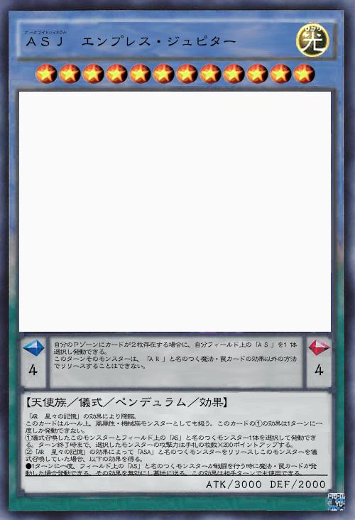 | 「AR 星々の記憶」の効果により降臨。 このカードはルール上、風属性・機械族モンスターとしても扱う。このカードの①の効果は1ターンに一度しか発動できない。 ①儀式召喚したこのモンスターとフィールド上の「AS」と名のつくモンスター1体を選択して発動できる。ターン終了時まで、選択したモンスターの攻撃力は手札の枚数×200ポイントアップする。 ②「AR 星々の記憶」の効果によって「ASA」と名のつくモンスターをリリースしこのモンスターを儀式召喚していた場合、以下の効果を得る。 ●1ターンに一度、フィールド上の「AS」と名のつくモンスターが戦闘を行う時に魔法・罠カードが発動した場合発動できる。その効果を無効にし墓地に送る。この効果は相手ターンでも使用できる。 | |||