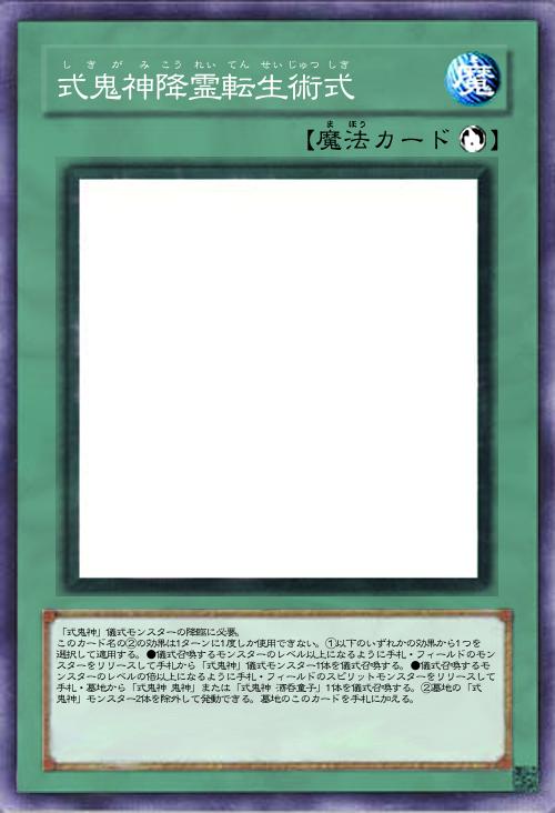 | 「式鬼神」儀式モンスターの降臨に必要。 このカード名の②の効果は1ターンに1度しか使用できない。①以下のいずれかの効果から1つを選択して適用する。●儀式召喚するモンスターのレベル以上になるように手札・フィールドのモンスターをリリースして手札から「式鬼神」儀式モンスター1体を儀式召喚する。●儀式召喚するモンスターのレベルの倍以上になるように手札・フィールドのスピリットモンスターをリリースして手札・墓地から「式鬼神 鬼神」または「式鬼神 酒呑童子」1体を儀式召喚する。②墓地の「式鬼神」モンスター2体を除外して発動できる。墓地のこのカードを手札に加える。 | |||