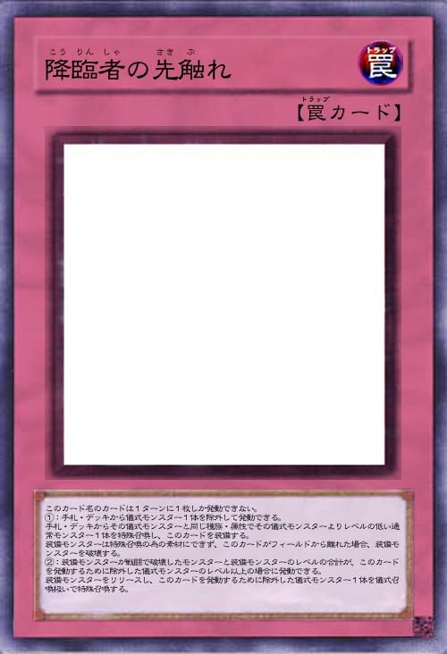 | このカード名のカードは1ターンに1枚しか発動できない。 ①:手札・デッキから儀式モンスター1体を除外して発動できる。 手札・デッキからその儀式モンスターと同じ種族・属性でその儀式モンスターよりレベルの低い通常モンスター1体を特殊召喚し、このカードを装備する。 装備モンスターは特殊召喚の為の素材にできず、このカードがフィールドから離れた場合、装備モンスターを破壊する。 ②:装備モンスターが戦闘で破壊したモンスターと装備モンスターのレベルの合計が、このカードを発動するために除外した儀式モンスターのレベル以上の場合に発動できる。 装備モンスターをリリースし、このカードを発動するために除外した儀式モンスター1体を儀式召喚扱いで特殊召喚する。 | |||