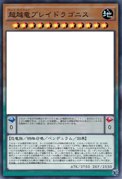| このカードは通常召喚できず、カードの効果でのみ特殊召喚できる。このカード名の(1)(2)(3)の効果はそれぞれ1ターンに1度しか使用できない。(1):このカードが手札・墓地に存在する場合、またはこのカードがEXデッキに表側表示で存在する場合に発動できる。このカード以外の自分の手札・フィールドの恐竜族モンスター2体を選んで破壊し、このカードを特殊召喚できる。(2):デッキから恐竜族モンスター1体を墓地へ送って発動できる。ターン終了時まで、墓地へ送ったモンスターと同じ属性の相手フィールドの全ての表側表示モンスターの攻撃力・守備力は0になり、効果は無効化される。このカードが墓地から特殊召喚されていた場合、この効果の発動に対して相手は効果を発動できない。(3):このカードが破壊された場合に発動できる。自分の墓地から通常モンスター1体を選んでデッキに戻す。その後、このカードを特殊召喚できる。 | |||