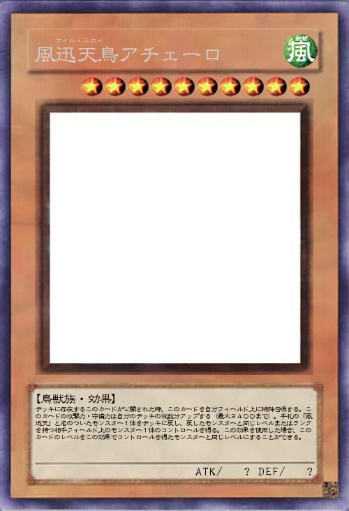 デッキに存在するこのカードが公開された時、このカードを自分フィールド上に特殊召喚する。このカードの攻撃力・守備力は自分のデッキの枚数分アップする(最大3400まで)。手札の「風迅天」と名のついたモンスター1体をデッキに戻し、戻したモンスターと同じレベルまたはランクを持つ相手フィールド上のモンスター1体のコントロールを得る。この効果を使用した場合、このカードのレベルをこの効果でコントロールを得たモンスターと同じレベルにすることができる。 |