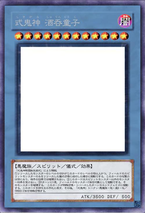 | 「式鬼神降霊転生術式」により降臨。 ①リリースしたモンスターのレベルの合計がこのカードのレベルの倍以上かつ、フィールドのスピリットモンスターのみをリリースした儀式召喚に成功した場合に発動できる。このカードの攻撃力は倍になり、相手の効果では破壊されない。②このカードはスピリットモンスター以外のモンスター効果を受けない。③1ターンに1度、フィールドのモンスター1体を対象にして発動できる。そのモンスターを破壊する。➃このカードが特殊召喚・リバースしたターンのエンドフェイズに発動する。このカードを持ち主の手札に戻す。その後、「式鬼神」トークン(悪魔族・地・星6・攻/守500)2体を特殊召喚する。 | |||