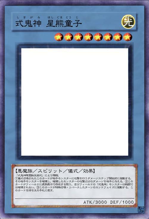 | 「式鬼神降霊転生術式」により降臨。 ①儀式召喚されたこのカードが相手モンスターに攻撃を行うダメージステップ開始前に発動する。その相手モンスターを破壊し、破壊したモンスターの攻撃力分のダメージを相手に与える。②このカードがフィールドに表側表示で存在する限り、自分フィールドの「式鬼神」モンスターは戦闘では破壊されない。③このカードが特殊召喚・リバースしたターンのエンドフェイズに発動する。このカードを持ち主の手札に戻す。 | |||