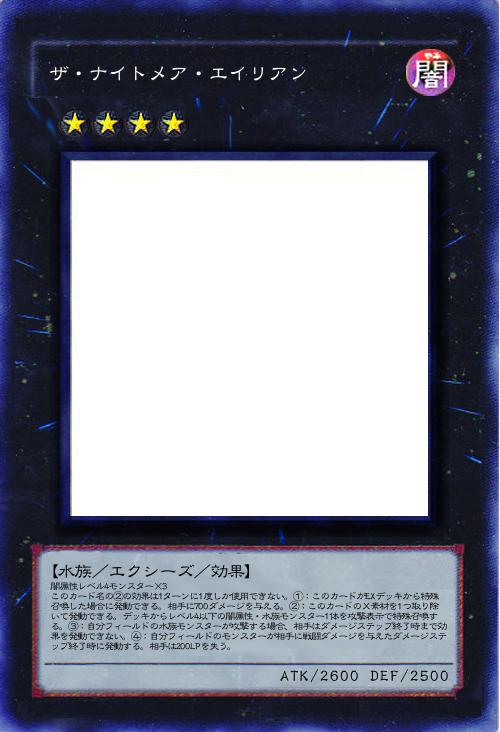 | 闇属性レベル4モンスター×3 このカード名の②の効果は1ターンに1度しか使用できない。①:このカードがEXデッキから特殊召喚した場合に発動できる。相手に700ダメージを与える。②:このカードのX素材を1つ取り除いて発動できる。デッキからレベル4以下の闇属性・水族モンスター1体を攻撃表示で特殊召喚する。③:自分フィールドの水族モンスターが攻撃する場合、相手はダメージステップ終了時まで効果を発動できない。④:自分フィールドのモンスターが相手に戦闘ダメージを与えたダメージステップ終了時に発動する。相手は200LPを失う。 | |||