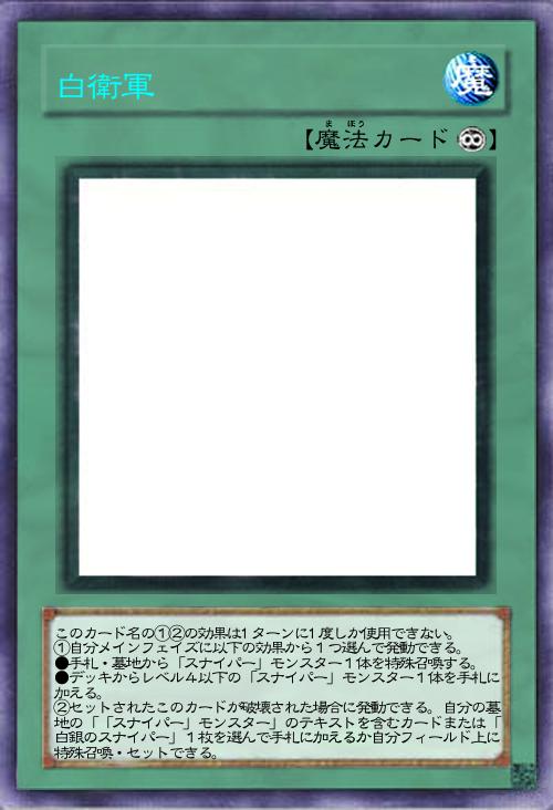 | このカード名の①②の効果は1ターンに1度しか使用できない。 ①自分メインフェイズに以下の効果から1つ選んで発動できる。 ●手札・墓地から「スナイパー」モンスター1体を特殊召喚する。 ●デッキからレベル4以下の「スナイパー」モンスター1体を手札に加える。 ②セットされたこのカードが破壊された場合に発動できる。自分の墓地の「「スナイパー」モンスター」のテキストを含むカードまたは「白銀のスナイパー」1枚を選んで手札に加えるか自分フィールド上に特殊召喚・セットできる。 | |||