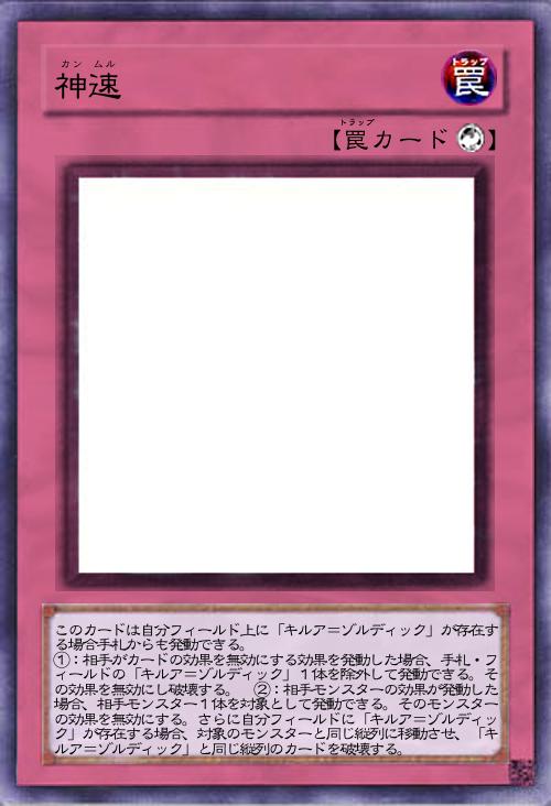 | このカードは自分フィールド上に「キルア=ゾルディック」が存在する場合手札からも発動できる。 ①:相手がカードの効果を無効にする効果を発動した場合、手札・フィールドの「キルア=ゾルディック」1体を除外して発動できる。その効果を無効にし破壊する。 ②:相手モンスターの効果が発動した場合、相手モンスター1体を対象として発動できる。そのモンスターの効果を無効にする。さらに自分フィールドに「キルア=ゾルディック」が存在する場合、対象のモンスターと同じ縦列に移動させ、「キルア=ゾルディック」と同じ縦列のカードを破壊する。 | |||