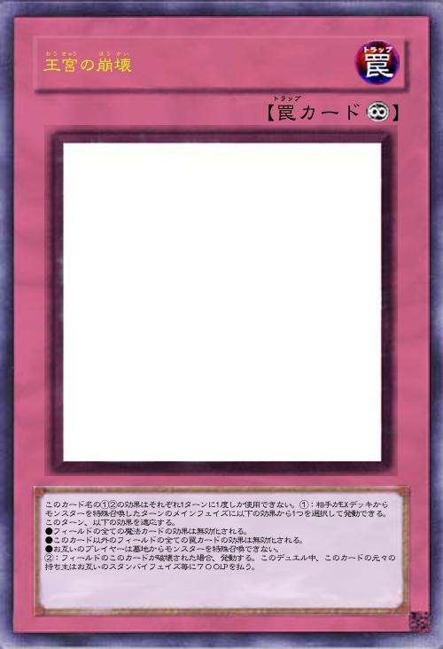 | このカード名の①②の効果はそれぞれ1ターンに1度しか使用できない。①:相手がEXデッキからモンスターを特殊召喚したターンのメインフェイズに以下の効果から1つを選択して発動できる。このターン、以下の効果を適応する。 ●フィールドの全ての魔法カードの効果は無効化される。 ●このカード以外のフィールドの全ての罠カードの効果は無効化される。 ●お互いのプレイヤーは墓地からモンスターを特殊召喚できない。 ②:フィールドのこのカードが破壊された場合、発動する。このデュエル中、このカードの元々の持ち主はお互いのスタンバイフェイズ毎に700LPを払う。 | |||