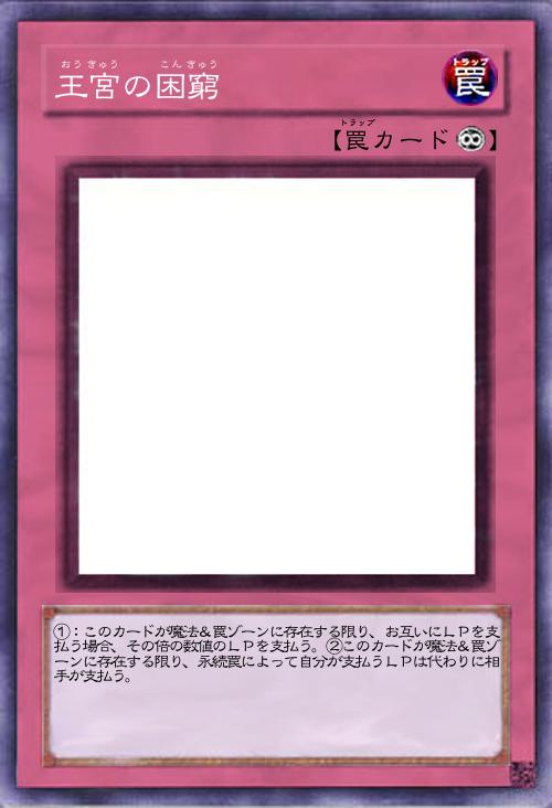 | ①:このカードが魔法&罠ゾーンに存在する限り、お互いにLPを支払う場合、その倍の数値のLPを支払う。②このカードが魔法&罠ゾーンに存在する限り、永続罠によって自分が支払うLPは代わりに相手が支払う。 | |||