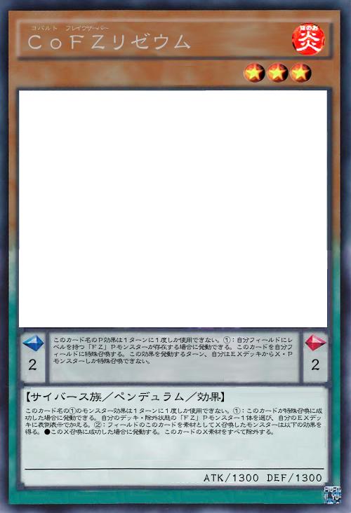 | このカード名のP効果は1ターンに1度しか使用できない。①:自分フィールドにレベルを持つ「FZ」Pモンスターが存在する場合に発動できる。このカードを自分フィールドに特殊召喚する。この効果を発動するターン、自分はEXデッキからX・Pモンスターしか特殊召喚できない。 | |||