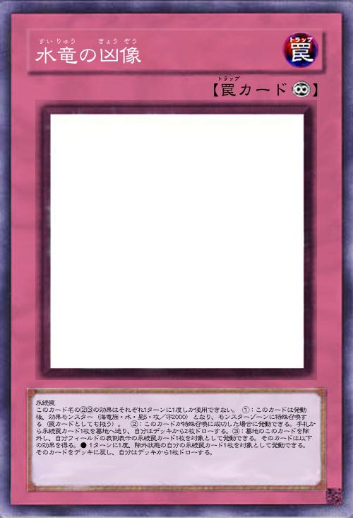 | 永続罠 このカード名の②③の効果はそれぞれ1ターンに1度しか使用できない。 ①:このカードは発動後、効果モンスター(海竜族・水・星5・攻/守2000)となり、モンスターゾーンに特殊召喚する(罠カードとしても扱う)。 ②:このカードが特殊召喚に成功した場合に発動できる。手札から永続罠カード1枚を墓地へ送り、自分はデッキから2枚ドローする。③:墓地のこのカードを除外し、自分フィールドの表側表示の永続罠カード1枚を対象として発動できる。そのカードは以下の効果を得る。● 1ターンに1度、除外状態の自分の永続罠カード1枚を対象として発動できる。そのカードをデッキに戻し、自分はデッキから1枚ドローする。 | |||