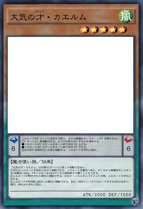 | 「大気の才・カエルム」の効果は1ターンに1度しか発動できない。 ①手札のこのカードを相手に見せて発動できる。このカードを墓地へ送り、デッキから風属性モンスターを1体墓地へ送る。PモンスターならEXデッキに表側表示で置くこともできる。 ②このカードが除外された場合に発動できる。次のターンのスタンバイフェイズ時、このカードを手札に加える。 ③このカードがP召喚に成功した場合に発動できる。自分・相手フィールドのカードをそれぞれ1枚ずつ選び、持ち主の手札に戻す。 | |||