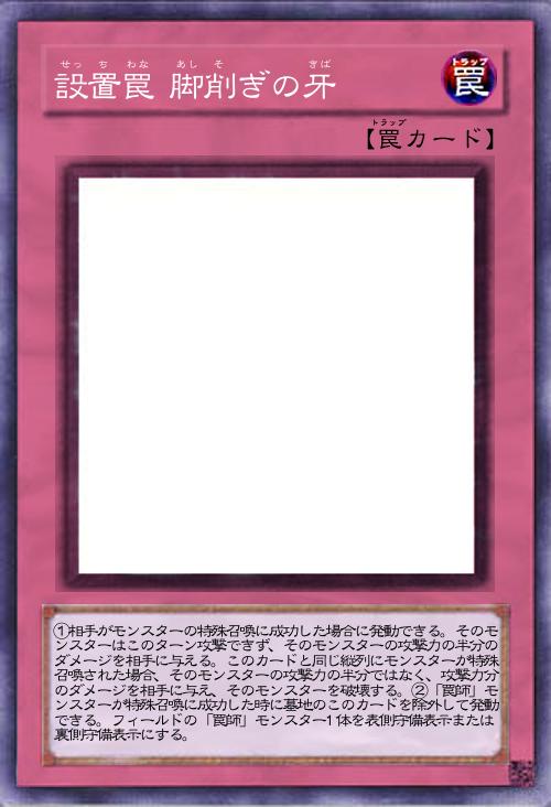 | ①相手がモンスターの特殊召喚に成功した場合に発動できる。そのモンスターはこのターン攻撃できず、そのモンスターの攻撃力の半分のダメージを相手に与える。このカードと同じ縦列にモンスターが特殊召喚された場合、そのモンスターの攻撃力の半分ではなく、攻撃力分のダメージを相手に与え、そのモンスターを破壊する。②「罠師」モンスターが特殊召喚に成功した時に墓地のこのカードを除外して発動できる。フィールドの「罠師」モンスター1体を表側守備表示または裏側守備表示にする。 | |||