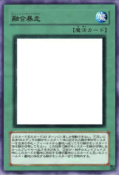 | このカード名のカードは1ターンに1度しか発動できない。①互いに自身のEXデッキの融合モンスター1体に記された融合素材モンスターを自身の手札・フィールドから墓地へ送ってその融合モンスター1体を融合召喚してもよい。この効果で融合モンスターを融合召喚しなかったプレイヤーはLPを半分失う。②自分・相手のエンドフェイズ時にこのカードが墓地に存在する場合墓地のこのカードと互いのフィールド・墓地に存在する融合モンスター全てを除外する。 | |||