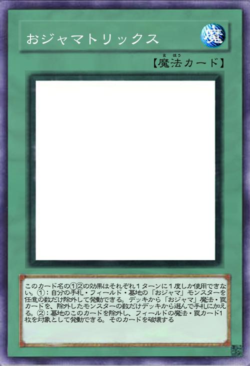 | このカード名の①②の効果はそれぞれ1ターンに1度しか使用できない。①:自分の手札・フィールド・墓地の「おジャマ」モンスターを任意の数だけ除外して発動できる。デッキから「おジャマ」魔法・罠カードを、除外したモンスターの数だけデッキから選んで手札に加える。②:墓地のこのカードを除外し、フィールドの魔法・罠カード1枚を対象として発動できる。そのカードを破壊する | |||