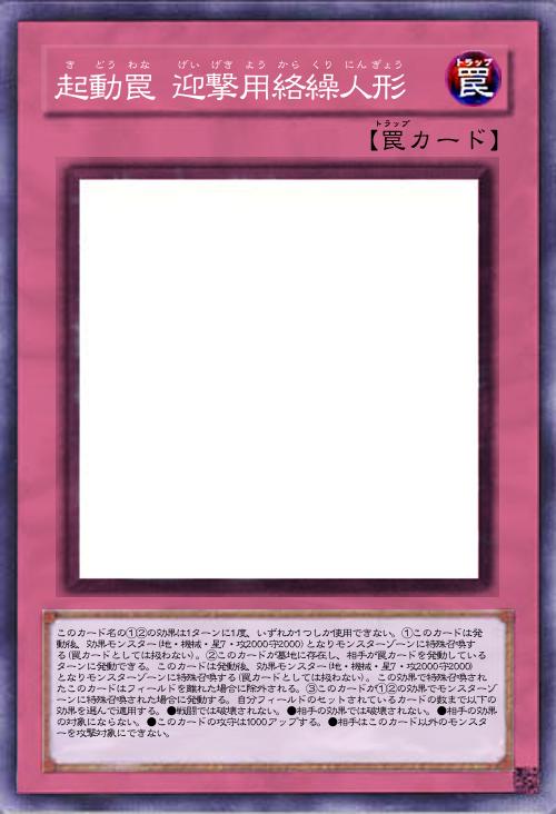 | このカード名の①②の効果は1ターンに1度、いずれか1つしか使用できない。①このカードは発動後、効果モンスター(地・機械・星7・攻2000守2000)となりモンスターゾーンに特殊召喚する(罠カードとしては扱わない)。②このカードが墓地に存在し、相手が罠カードを発動しているターンに発動できる。このカードは発動後、効果モンスター(地・機械・星7・攻2000守2000)となりモンスターゾーンに特殊召喚する(罠カードとしては扱わない)。この効果で特殊召喚されたこのカードはフィールドを離れた場合に除外される。③このカードが①②の効果でモンスターゾーンに特殊召喚された場合に発動する。自分フィールドのセットされているカードの数まで以下の効果を選んで適用する。●戦闘では破壊されない。●相手の効果では破壊されない。●相手の効果の対象にならない。●このカードの攻守は1000アップする。●相手はこのカード以外のモンスターを攻撃対象にできない。 | |||
